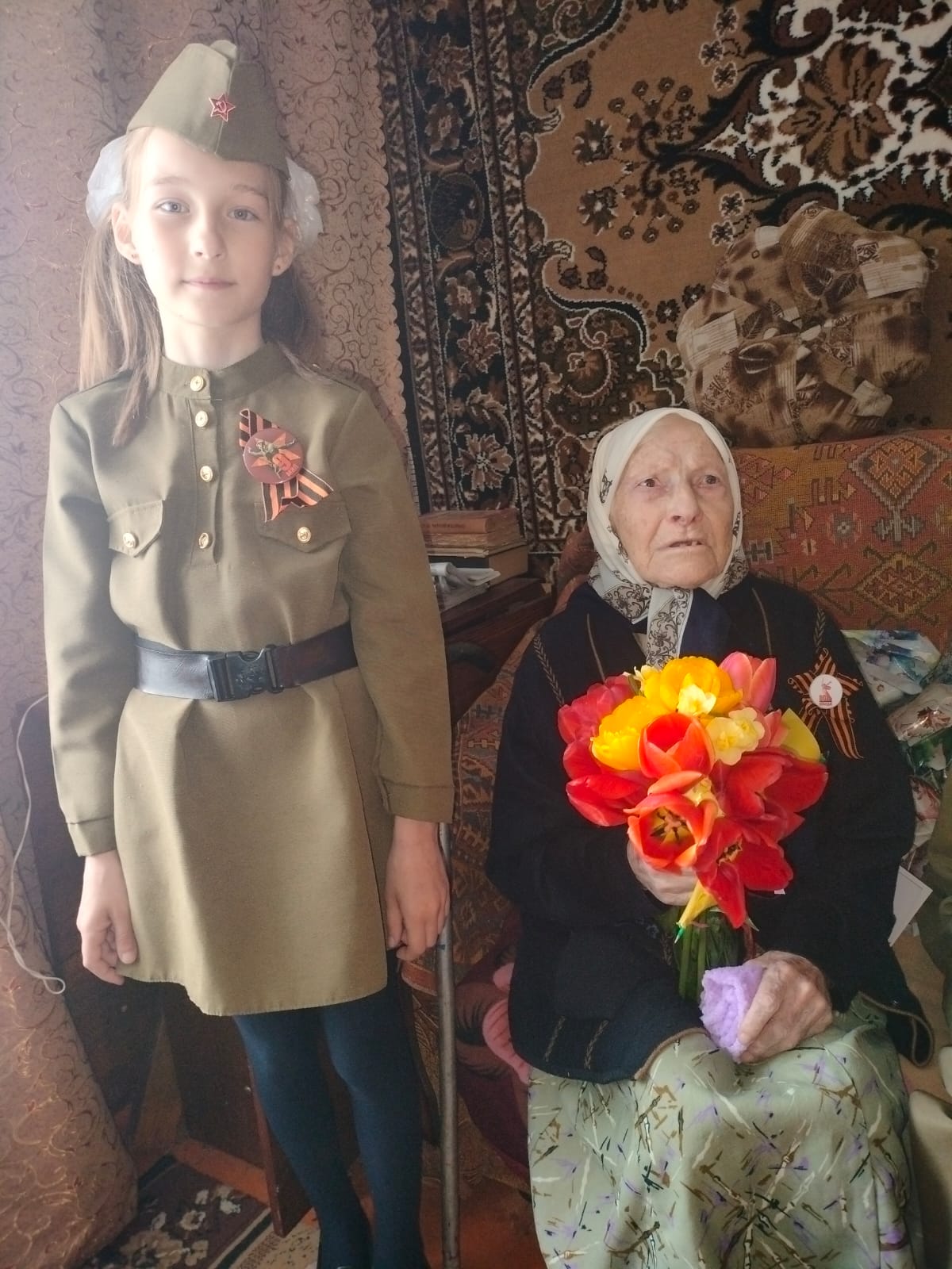 Дети-волонтеры для ветеранов прочитали стихи, вручили подарки, сделанные своими руками и памятный значок «80 лет Великой Победы».