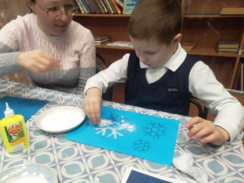 С помощью клея ПВА и соли дети создавали волшебные снежинки на бумаге, тренировались с маленькими и большими снежинками. Данный вид нетрадиционного рисования расширяет знания о явлениях природы, развивает внимание и мышление, улучшает мелкую моторику.
