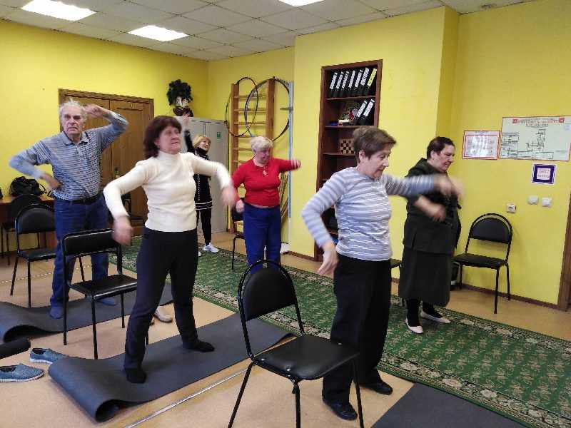 На занятии лечебной физкультурой пенсионеры приступили к разучиванию нового комплекса, включающего в себя упражнения на гибкость суставов и развитие мелкой моторики мышц.