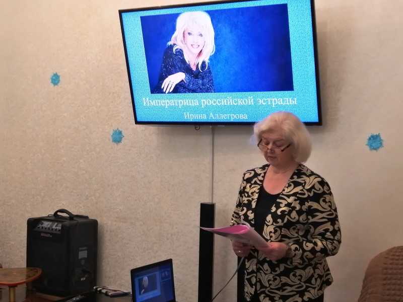 В отделении дневного пребывания волонтёром серебряного возраста Е.Л. Типашовой была проведена новая музыкальная программа «Императрица российской эстрады», так называют Ирину Аллегрову. Певица рассказала, откуда взялось её прозвище.